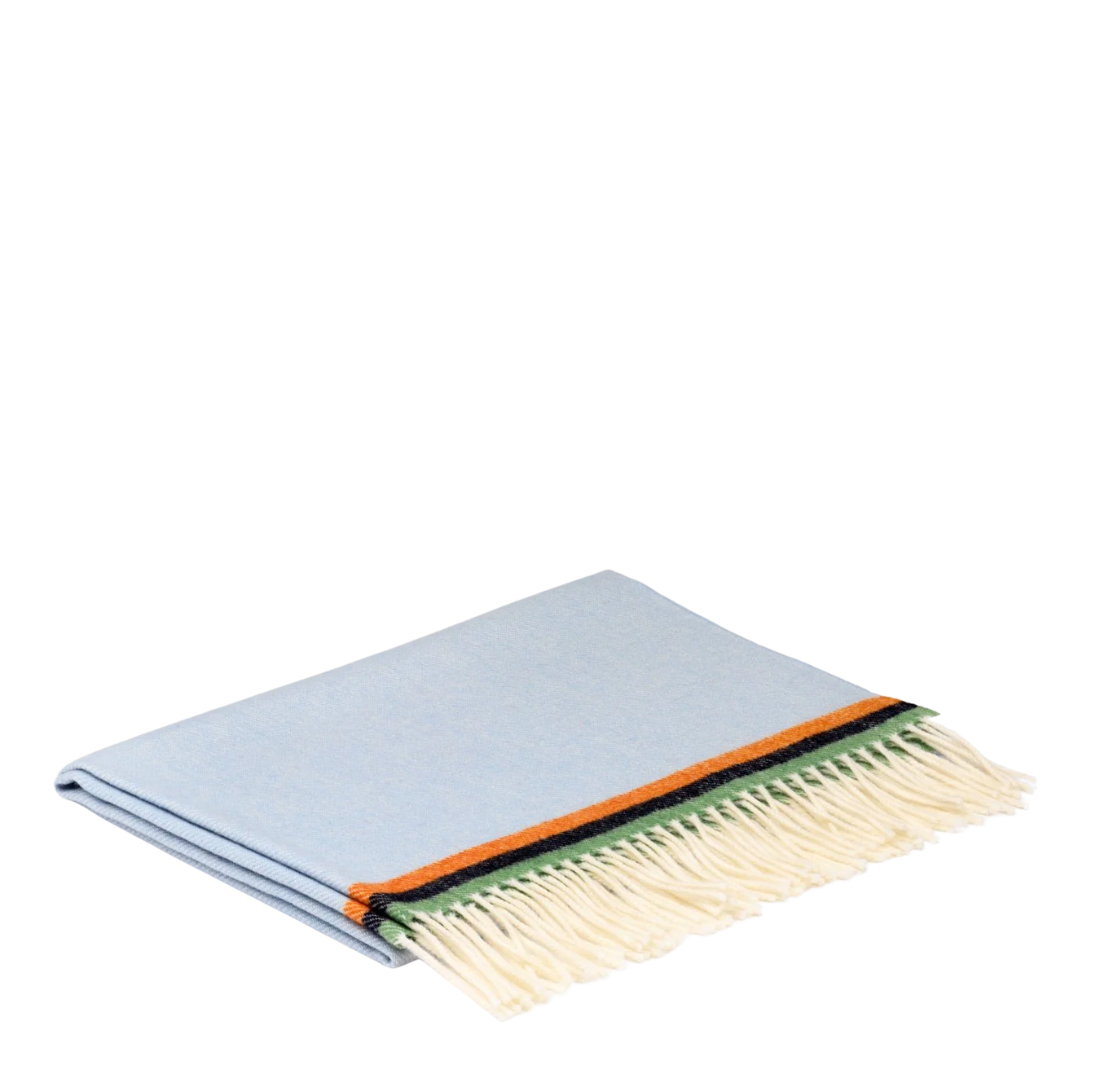 A blanket in a clear, bright blue herringbone with a bold stripe of orange, navy and green running along each end — the kind of colour combination that is spirited and playful without being loud. The blue is the anchor, the stripe gives it its character. A gift that feels considered and distinctive. Presented in a gift box.