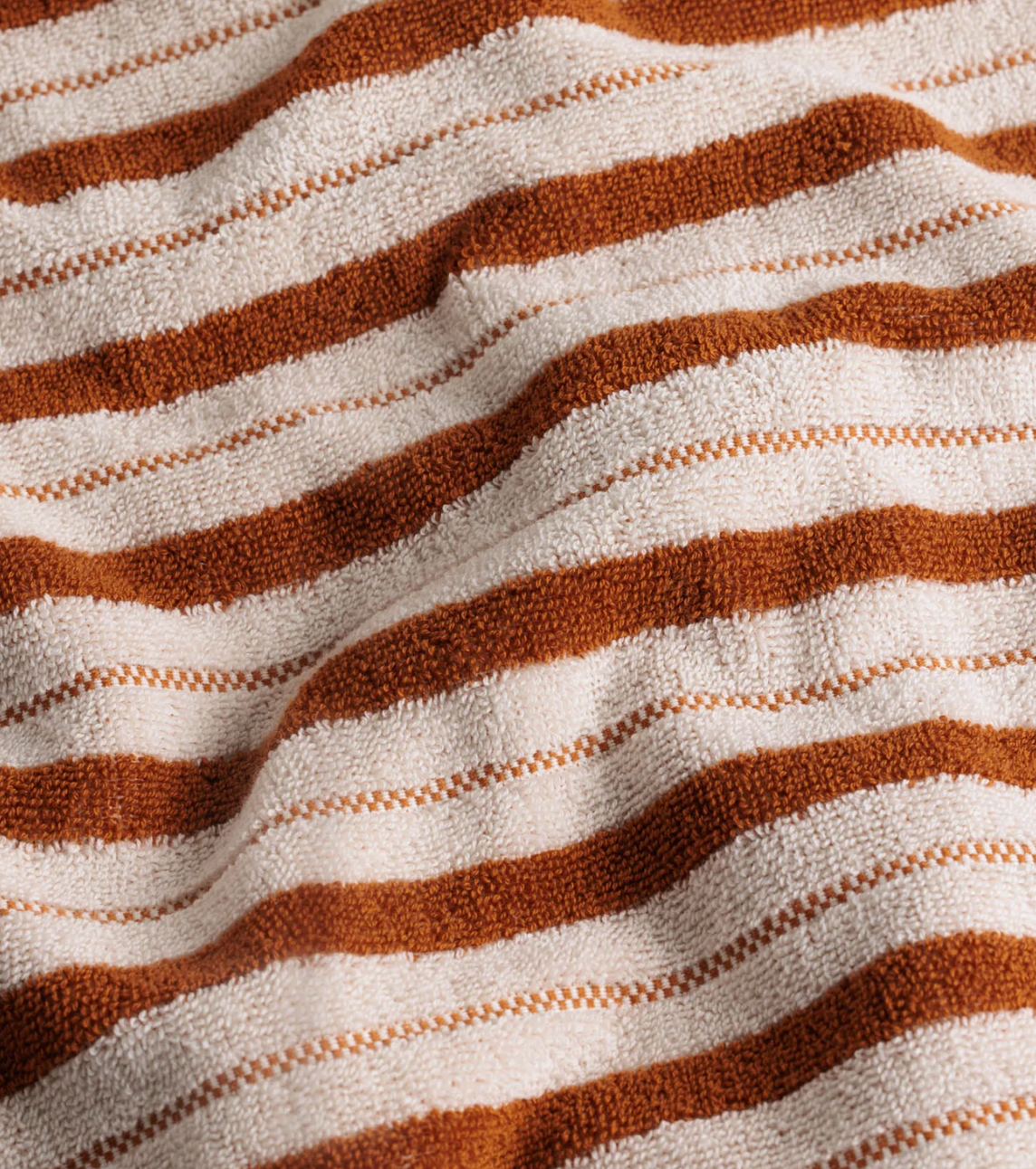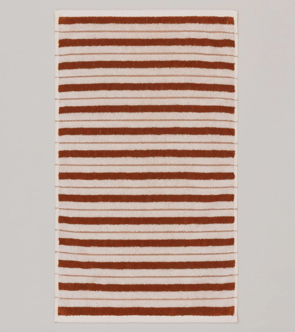 100% Organic Cotton hand towel with a luxuriously soft handle. Defined by the pairing of a classic stripe, and embroidered gridded check, the San Luis colour way is warm, yet fresh, conjuring familiarity in the bathing space.