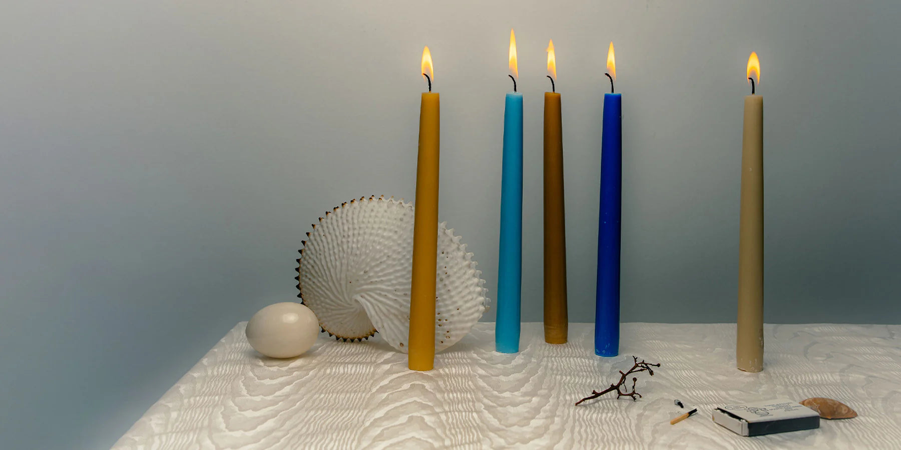 The Port Lligat set of candles tells the story of an afternoon on the beach, from the different sand colours to the various sea shades as you swim away from shore, all captured across five coloured chandelles: caramel, miel, raffia, sky, and royal blue.