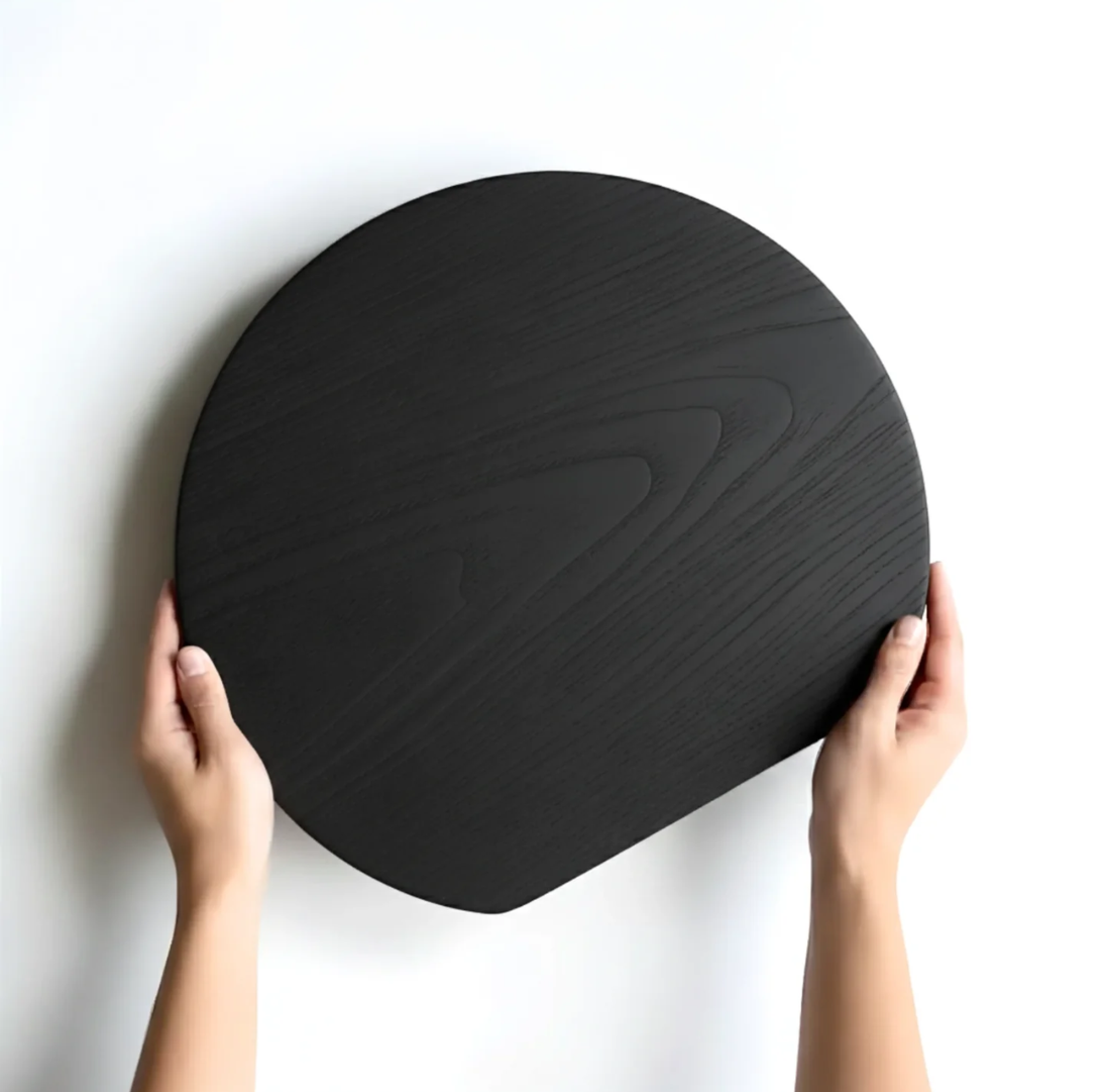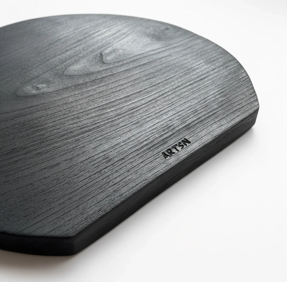 ARTSN boards are flame-charred one by one using the Yakisugi method, then brushed back to uncover grain revealed only through fire. The charred carbon layer is naturally water-repellent and antimicrobial: liquids bead off the surface rather than penetrating, and bacteria cannot take hold the way it can in untreated timber. No mass production. No shortcuts.