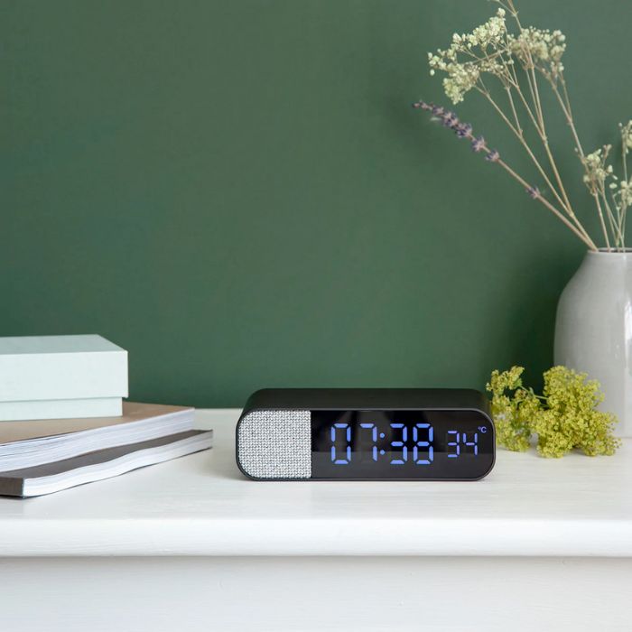 Multi-functional alarm clock with speaker, wireless charging and LED light features.
