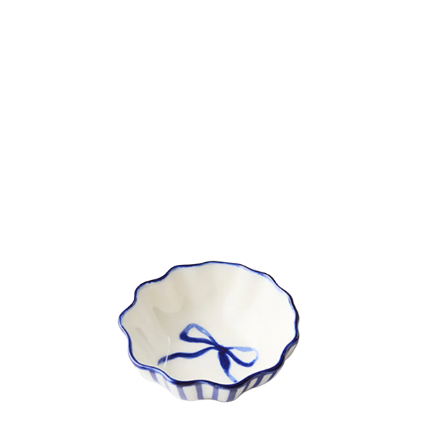 Scalloped edges rise to meet careful brushstrokes of indigo blue in this petite earthenware dish. Designed in Sydney and hand-painted in Vietnam, the Margot Dish cradles your most precious objects rings, earrings, while its ribbon-like decoration transforms average spaces into sanctuaries of whimsical beauty.