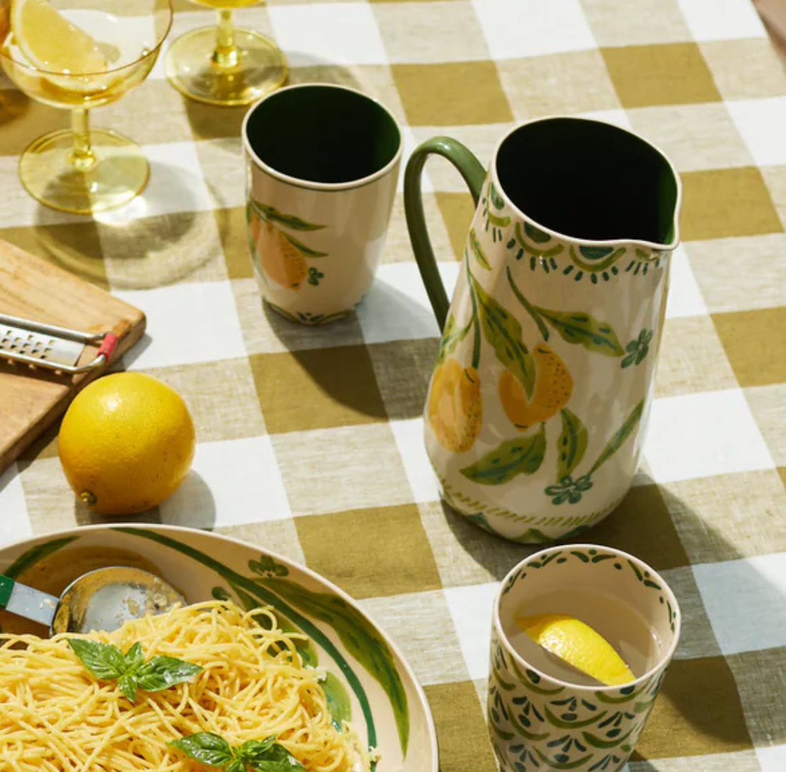 Sun-drenched lemons dance across this generous pitcher, their vibrant hues hand-painted against creamy earthenware.