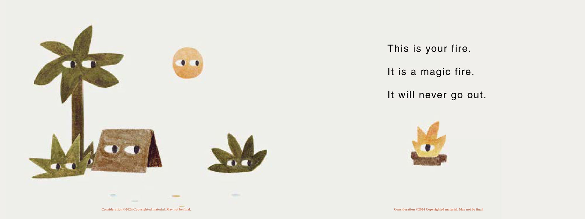 With a minimal tableau of familiar objects and a gentle rhythm suited for reading aloud, an island and all its items – a tent, a fire, a boat, a bird – are assembled, ending with bedtime as the sun goes down. This is an island for a young child to have whenever they want to go there. One in a trio of board books focussing on safe spaces, comfort and imagination, Your Island signals both a departure for Jon Klassen and a story whose peculiar touches of whimsy stamp the book as iconically his.